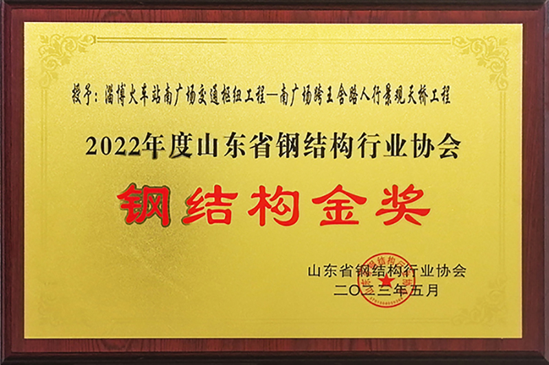6月16—18日在環渤海地區鋼結構行業發展峰會暨山東省鋼結構行業協會年會上,山東經典重工集團股份有限公司承建的淄博火車站南廣場交通樞紐工程——南廣場跨王舍路人行景觀天橋工程榮獲2022年度山東省鋼結構協會鋼結構金獎。