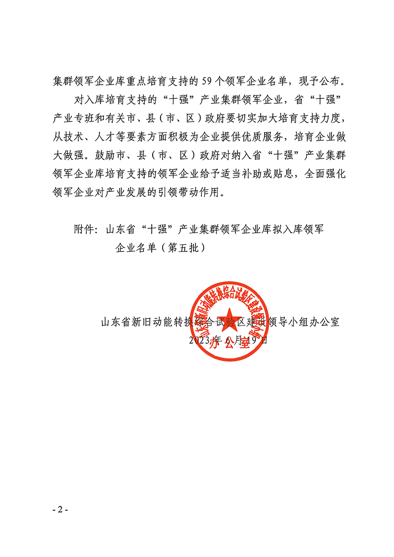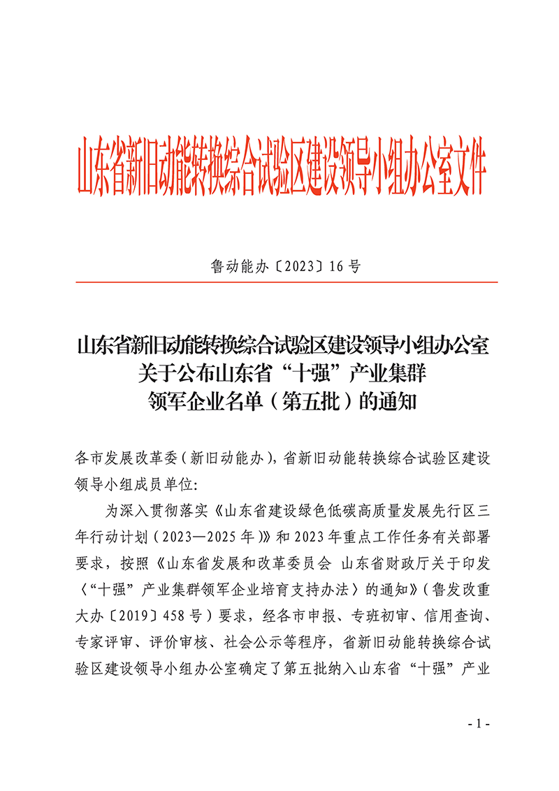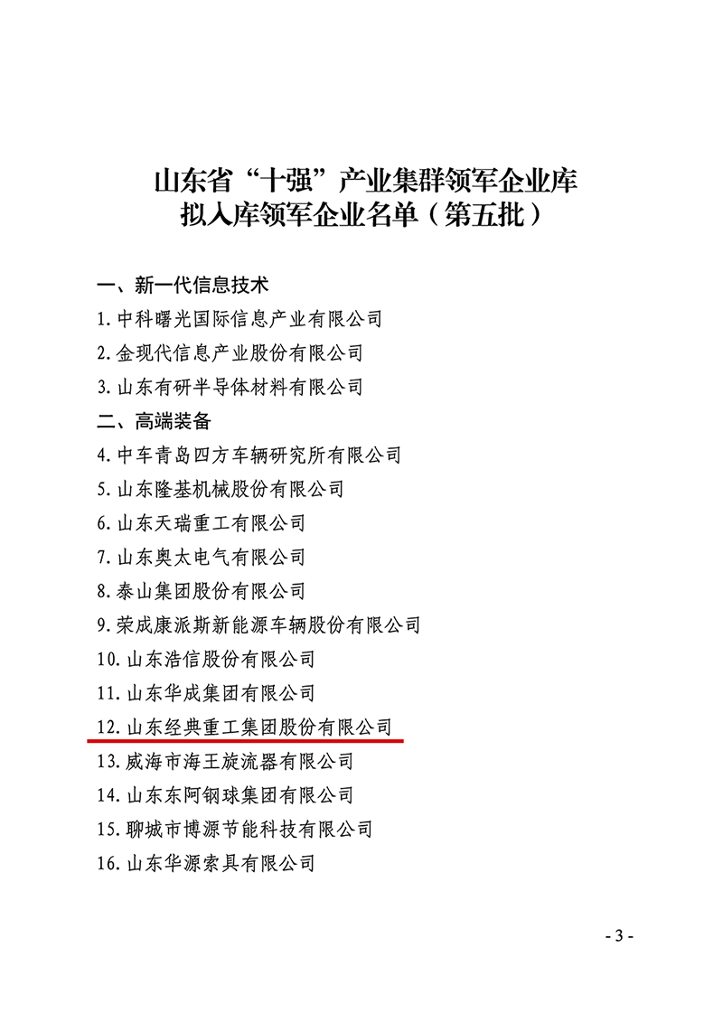 6月19日,山東省新舊動(dòng)能轉(zhuǎn)換綜合試驗(yàn)區(qū)建設(shè)領(lǐng)導(dǎo)小組辦公室發(fā)布了《關(guān)于公布山東省“十強(qiáng)”產(chǎn)業(yè)集群領(lǐng)軍企業(yè)名單(第五批)的通知》(魯動(dòng)能辦【2023】16號(hào)),山東經(jīng)典重工集團(tuán)股份有限公司成功入選山東省“十強(qiáng)“產(chǎn)業(yè)集群領(lǐng)軍企業(yè)名單。